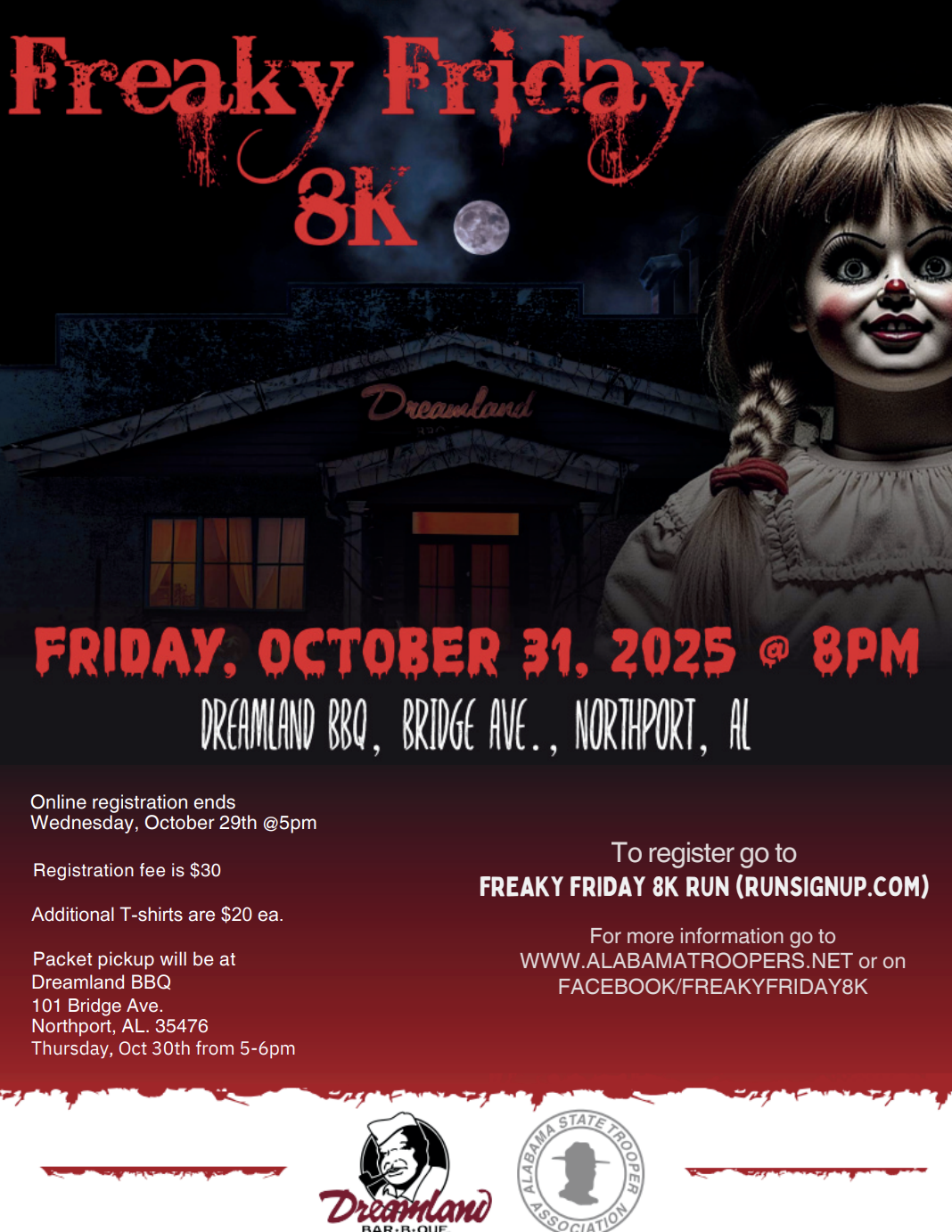 Register online here: https://runsignup.com/Race/AL/Northport/FreakyFriday8KRun