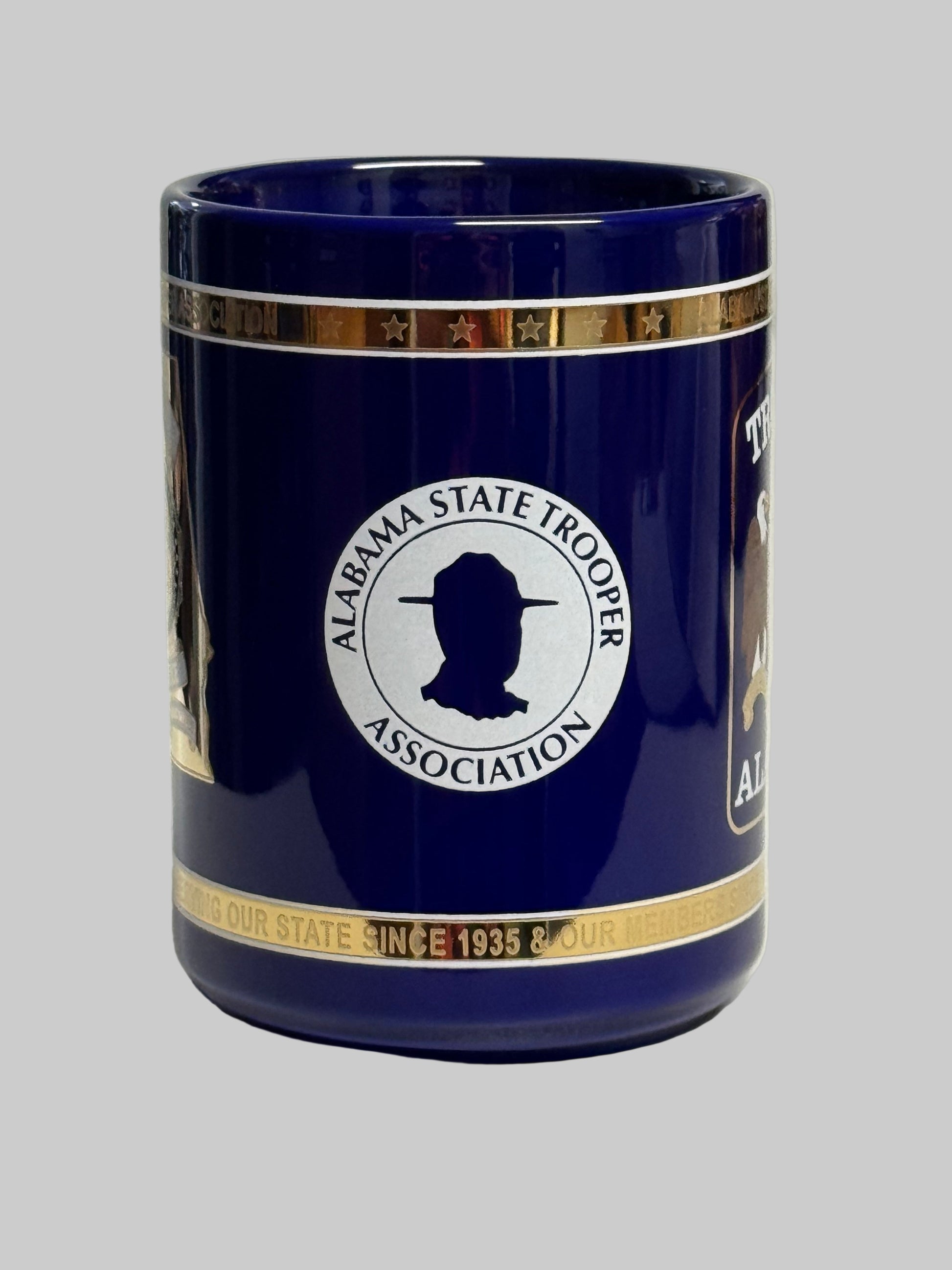 Blue ceramic coffee mug with a gold-leafed ALEA State Trooper badge and Trooper patch.